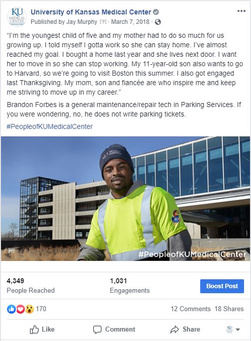 It’s a common misconception that the University of Kansas Medical Center is the same as The University of Kansas Health System — understandably so — the two organizations are intertwined on a shared campus. To help distinguish the medical center from the hospital, I created the People and Students of KU Medical Center campaigns to tell the stories of the people who work and study within the medical center. The primary goal of the campaign was to educate people on the differences between the two organizations.