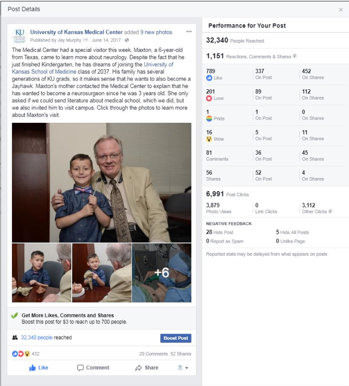 My all-time favorite social media post wasn’t planned. It started when I received a message from Maxton’s mom, Tara. Maxton’s dream is to go to KU Medical Center to study neurology. Tara asked if we could send some pamphlets or admissions materials to Maxton so he could learn more about the medical center. I gathered several pamphlets and magazines, but also included pins, keychains and a plush Jayhawk with a handwritten note inviting Maxton to visit our campus for a special tour.